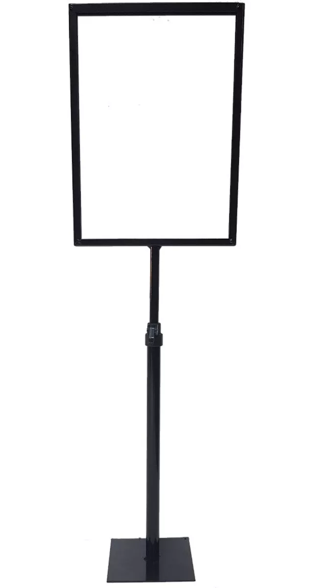 Kit com 6 pedestais porta cartaz A4 com regulagem de altura e protetor acrílico. Sistema click de ajuste de 60cm a 90cm. Material metálico resistente com acabamento preto brilho.